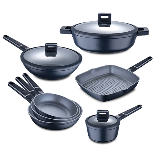 SET 10 PZS – SARTEN 20, 24 y 26 CM, CAZO 16 CM, CACEROLA BAJA 28 CM, SARTEN ASADOR 28 CM y WOK 28 CM, ALUMINIO FUNDIDO IND INDIGO MP