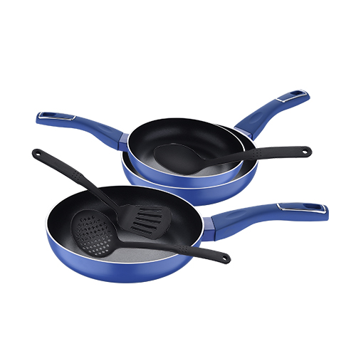 San Ignacio Índigo – Juego de 3 Sartenes de 20, 24 y 28 cm y Utensilios de cocina, Antiadherentes, de Aluminio Prensado con Mango Ergonómico, Sin PFOA