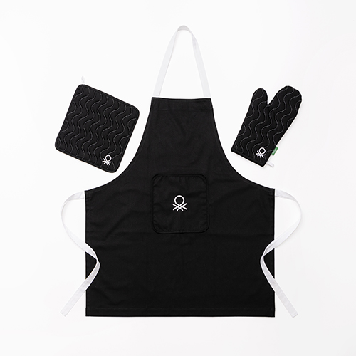 Benetton Black & White – Set 3 Piezas Delantal (Delantal + Manopla + Agarrador) 75 x 85 cm, 100 % Algodón, 190 gsm, Suavidad Excepcional, Certificación Oeko-Tex y Better Cotton Initiative, Negro