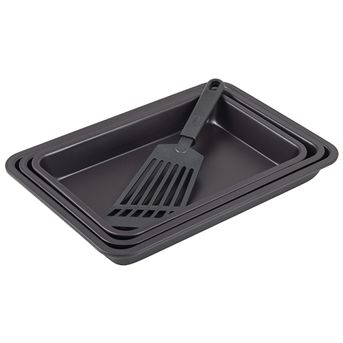 SET 4PZS FUENTE PARA ASAR: 1 FUENTE PEQUEÑA P/ ASAR (28.5X19.5X3.5CM) + 1 FUENTE MEDIANA P/ ASAR (31.5X21.5X3.5CM) + 1 FUENTE GRANDE P/ ASAR (34X24X3.5CM) + 1 ESPATULA ACERO AL CARBONO CHARCOAL BG