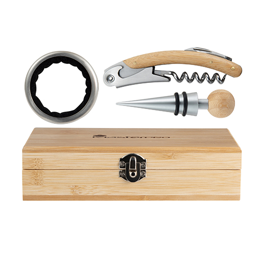 SET 3PZS UTENSILIOS P/ VINO: 1 SACACORCHOS DE CAMARERO (11X2.8X1.3CM) + 1 TAPON DE VINO (2.3X2.3X9.4CM) + 1 CUELLO DE VINO (4X4X2CM) ACERO INOX C/ CAJA DE BAMBU LIDL MP