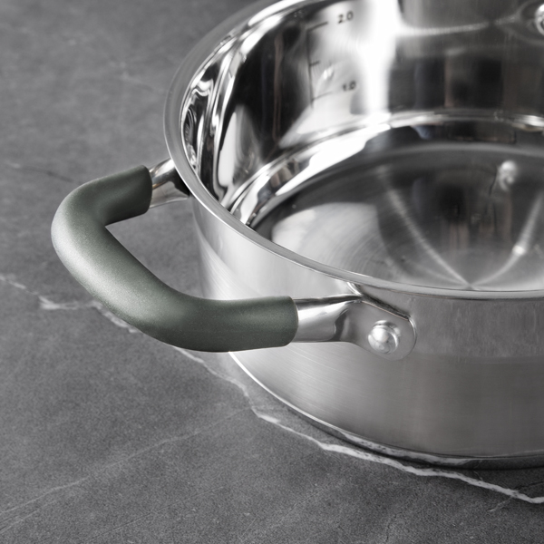Cocina eficiente con la cacerola de 28 cm y 9.5 L de gran capacidad de Midnight. Fabricada en acero inoxidable, un material excepcionalmente duradero y casi imposible de desgastar que, unido a un fondo encapsulado de aluminio, cuenta con una conductividad térmica excelente, consiguiendo un cocinado uniforme para un gran ahorro de energía. Cocina de manera cómoda y segura con las asas de acero inoxidable con silicona en color verde de tacto suave para un agarre robusto. La cacerola posee un tapa de cristal con salida de vapor y pomo con silicona que se mantiene fría, perfecta para controlar el cocinado de los alimentos. La base de inducción es apta para cocinar en cualquier placa de cocina del mercado y su diseño brillante con escala de medición en el interior te permitirá cocinar con precisión. Una pieza práctica y de fácil limpieza en el lavavajillas para completar tu cocina.