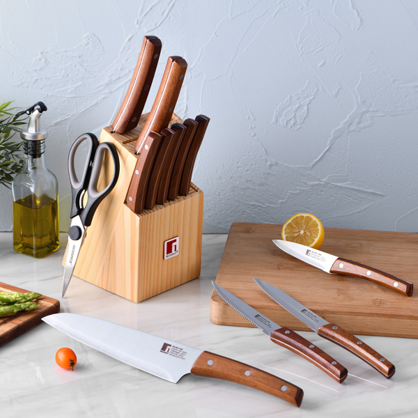•Cuchillo de chef para picar, cortar y aplastar; cuchillo panero para cortar la corteza del pan fácilmente; cuchillo de trinchar para cortar lonchas más finas y precisas; cuchillo multiusos para cortar y recortar carne o verduras de mayor tamaño; cuchillo chuletero de sierra afilada para carne; cuchillo pelador para preparar frutas y verduras.