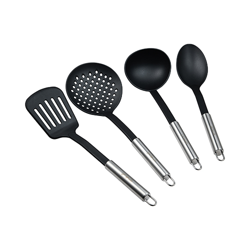 SET 4PZS UTENSILIOS DE COCINA: 1 SERVIDOR DE PASTA (31X7.3CM) + 1 CUCHARA PARA SERVIR (33X5.8CM) +1 CUCHARÓN (31X9CM) Y 1 ESPÁTULA RANURADA (31.5X7.4CM) PBT NEGRO