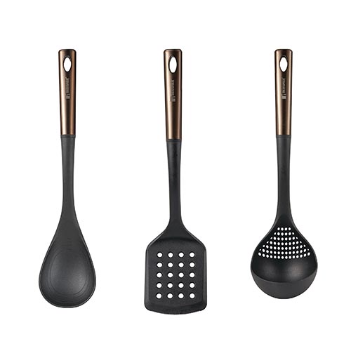 SET 3PZS UTENSILIOS DE COCINA: ESPATULA RANURADA + CUCHARA + CUCHARON PBT NEGRO + COBRE COPPER BG