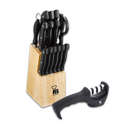 KIT RB-2528 + RB-2751: SET 15 PZS CUCHILLOS MADERA TACOMA + AFILADOR CUCHILLOS 20X9 TENESSY RB