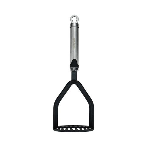 Bergner Gizmo – Aplastador de Patatas 26.5 x 8 cm, Fabricado en Acero Inoxidable, Ranuras Amplias que Facilitan la Presión, Agarre Ergonómico, Anillo Final para Colgar, Mango con Inserción en Negro